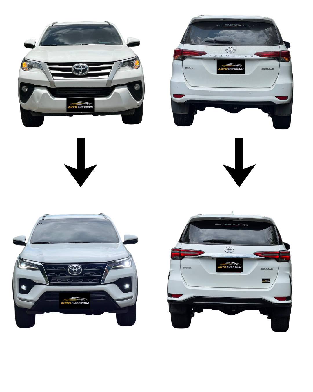 Renueva tu Toyota Fortuner modelo 2017 en adelante con un diseño más moderno, elegante y deportivo. Transforma su frente al estilo SRV 2025 y dale una apariencia más actual e imponente.