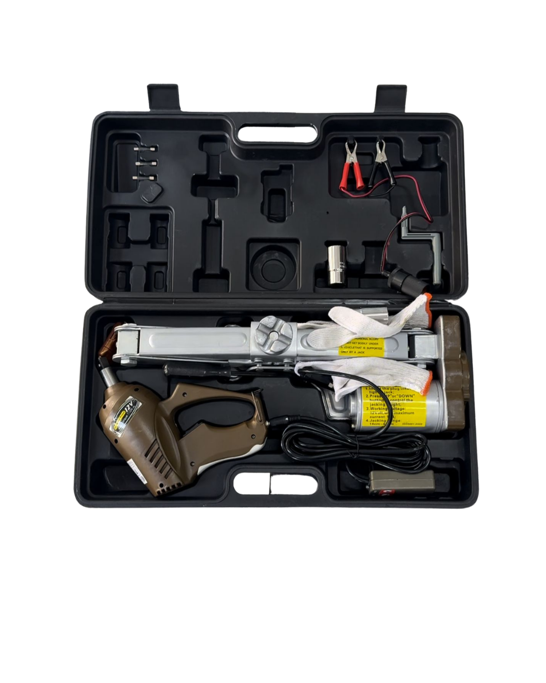 Gato eléctrico de 5 toneladas, potente y práctico para levantar vehículos de forma rápida y segura. Ideal para emergencias en carretera o trabajos en taller. Funciona con conexión al vehículo, facilitando el cambio de llantas sin esfuerzo.