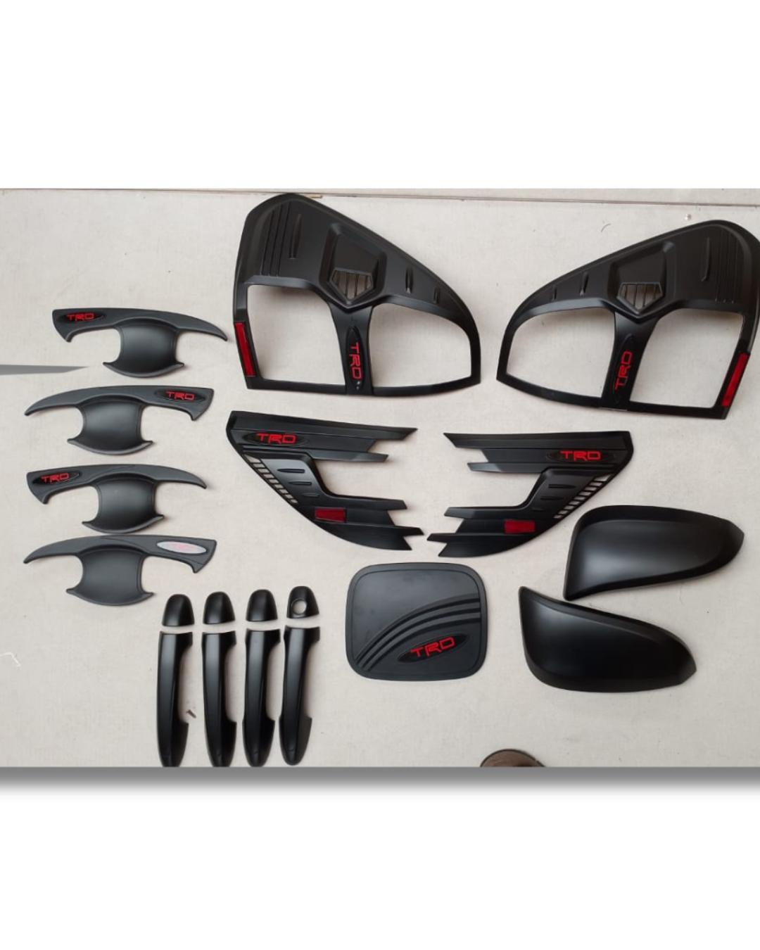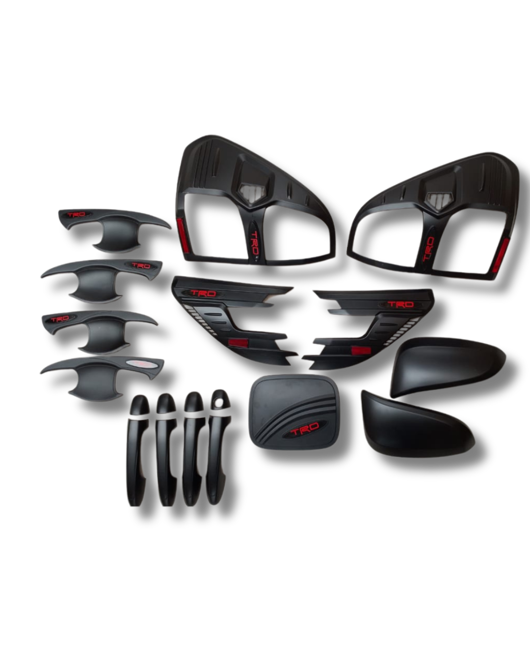 Dale un toque deportivo y agresivo al exterior de tu Toyota Hilux Revo con el Juego Pastas Negras Contramarcadas con la palabra TRD en rojo.